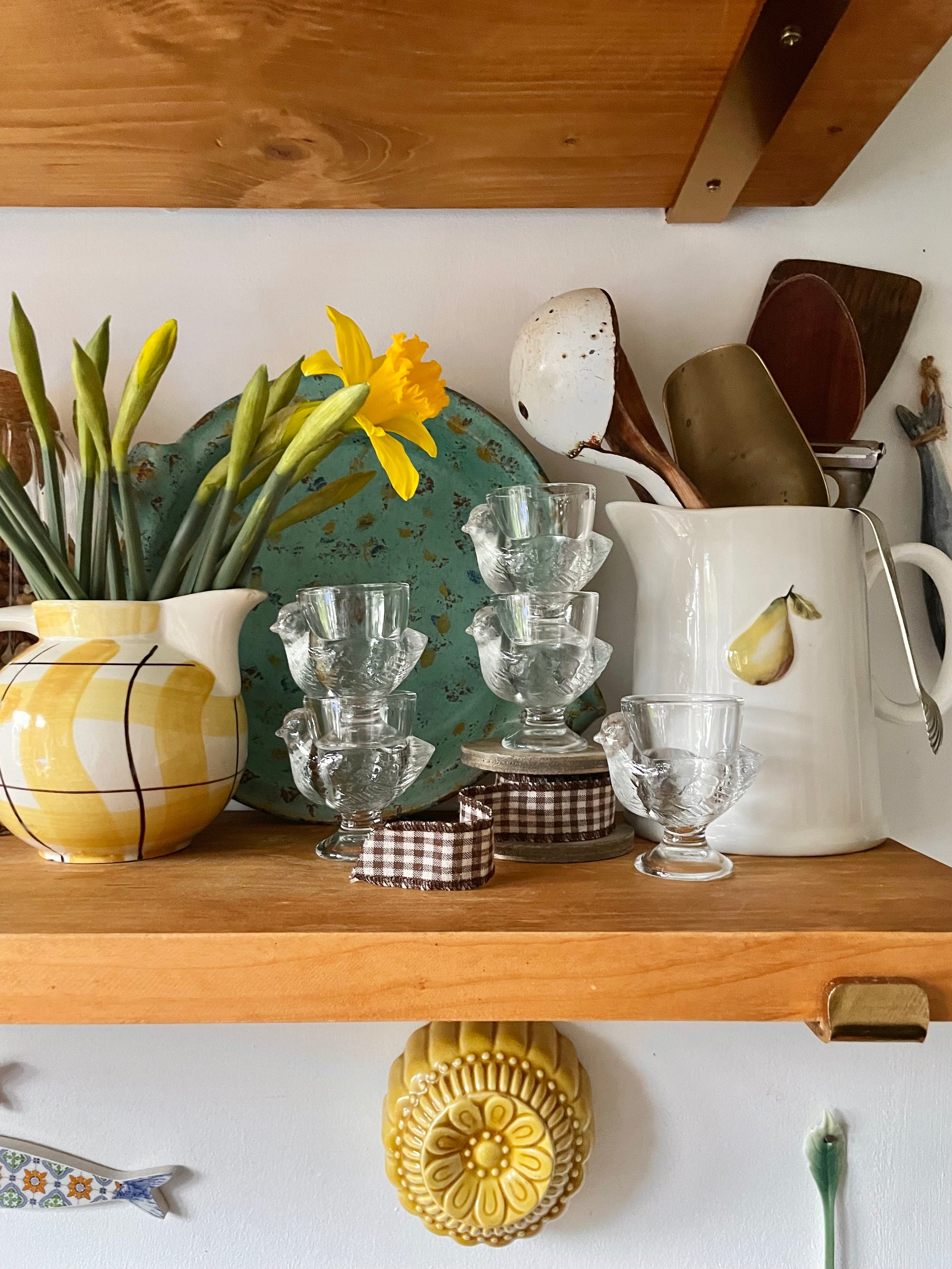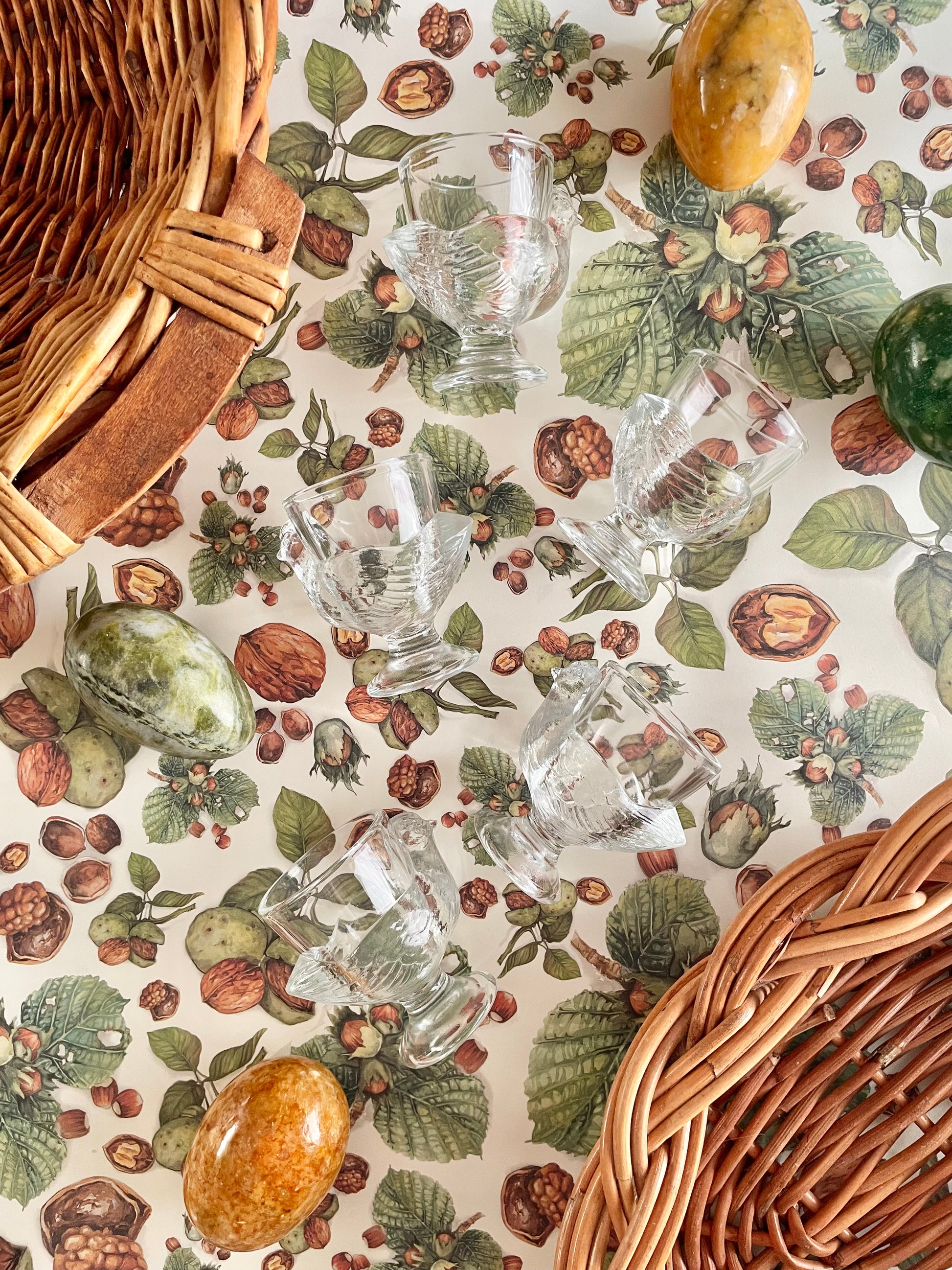 🥚A charming set of five clear glass chicken-shaped egg cups, made in France. Sweetly detailed from beak to tail, these bring instant farmhouse charm to the breakfast table and are a joy to use. Perfect for everyday breakfasts, spring tablescapes, or styled on open shelving when not in use. Timeless, simple, and wonderfully French.